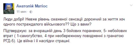 Главный военный прокурор Украины Анатолий Матиос в своем Facebook сделал противоречивое заявление о потерях на фронте на Донбассе у украинских бойцов.