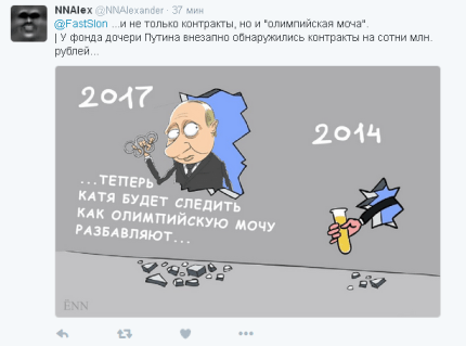 «Таким образом, документально доказывается получение фондом младшей дочери Путина 877 миллионов рублей (около 14 млн долл) за 2015-2016 годы. И мы на 100% уверены, что сумма будет ещё больше, ведь «целевых взносов» за 2016 год мы ещё не видим. Если предположить, что они не меньше, чем в 2015 году, то сумма составит больше миллиарда рублей», — говорится в материалах расследования.
