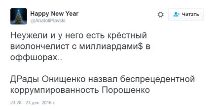 «Я лично был свидетелем, как президент Порошенко занимается коррупцией в массовом и беспрецедентном масштабе. За прошедшие три года я лично наблюдал, как Петр Порошенко крадет сотни миллионов долларов, запрашивая откаты от каждого контракта, связанного с любым государственным предприятием в Украине», - пишет Онищенко.