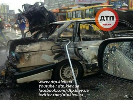 Транспортное средство попало в аварию, после чего были слышны взрывы и машина начала гореть. Вследствие возгорания автомобиля на дороге образовалась огромная пробка.