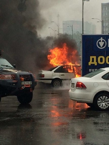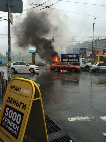В Киеве на перекрестке возле Ленинградской площади случилось дорожно-транспортное происшествие, в котором произошло возгорание автомобиля Volkswagen Passat.