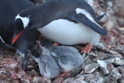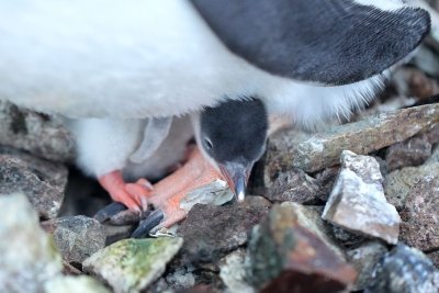 Они сейчас в сереньком пушке, очень смешные и неуклюжие, прячутся под родителей, но активно оттуда пищат. Есть семьи, в которых вылупилось уже по два пингвиненка, а есть такие, где один детеныш еще ожидает появления брата или сестры.