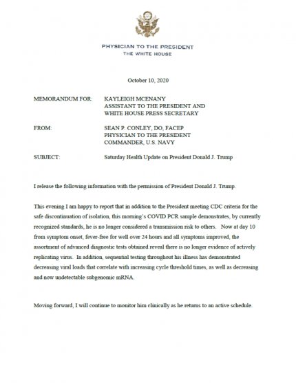 "В дополнение к тому, что президент соответствует критериям Центров по контролю и профилактике заболеваний, позволяющим безопасное прекращение изоляции, утренний тест (на наличие COVID-19) показал, что президент больше не представляет опасности для других в плане передачи (вируса)", - говорится в докладе врача.