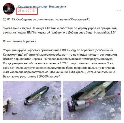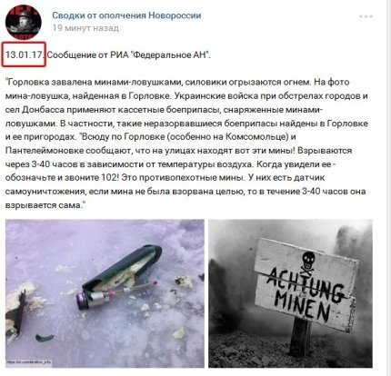 Блогер подметил, что свежеопубликованный фейк в группе "Сводки ополчения Новороссии" в соцсети ВКонтакте от 13 января 2017 года на самом деле является повтором фейка за 2015 год.