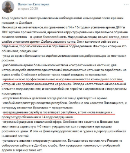 "Не смотря на значительное, по сравнению с 14 и 15 годами усиление армии ДНР и ЛНР артой и прочей техникой, армейское структурирование и правильное обучение личного состава – в целом боеспособность Народной милиции, на мой взгляд, даже слабее ополчения времен Дебальцевского котла", - написал он.