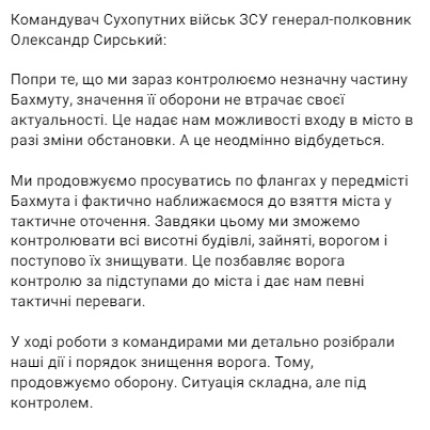 По словам Сырского, украинские силы контролируют незначительную часть Бахмута, однако значение ее обороны не теряет своей актуальности.