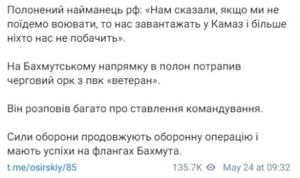 По словам командующего Сухопутными войсками ВСУ Александра Сырского, по состоянию на утро 24 мая Вооруженные силы Украины продолжают оборонную операцию и добились успехов на флангах Бахмута.