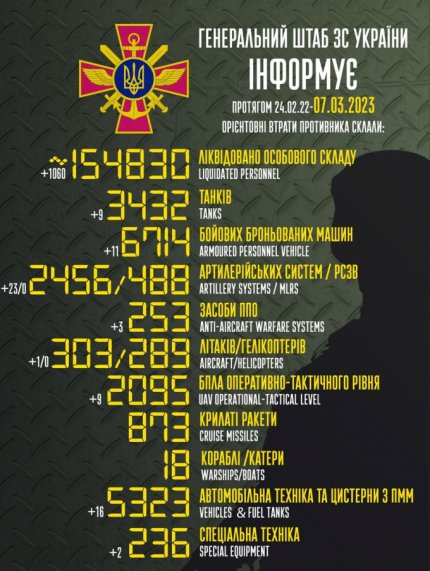 Общие боевые потери противника с 24.02.22 по 07.03.23 ориентировочно составили: