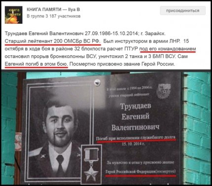 На фотографии указано, что некий Евгений Трундаев, старший лейтенант 200 ОМСБр ВС РФ, был инструктором в так называемой «армии ЛНР» и погиб в боях с ВСУ на Донбассе.