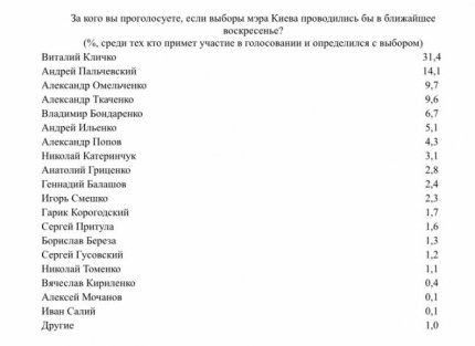 В опросе были указаны имена тех кандидатов, которые с наибольшей долей вероятности примут участие в выборах киевского мэра. Результаты исследования представлены в таблицах. Указаны ответы респондентов, которые решили принять участие в голосовании и уже определились со своим выбором.