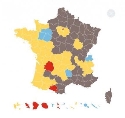 Карта результатів голосування у Франції. Жовтий – лідирує Макрон; сірий – Ле Пен; синій – Фійон; червоний – Меланшон. Ілюстрація: Le Monde