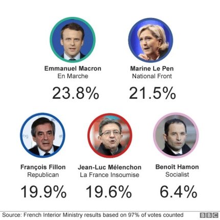 Перший раунд президентських виборів у Франції, який пройшов 23 квітня, показав колапс у підтримці основних правоцентристських і лівоцентристських партій, коли перемогу отримали незалежний центрист Еммануель Макрон і ультраправий кандидат від партії «Національний фронт» Марін Ле Пен.