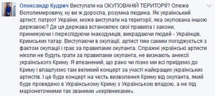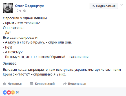 "Спросили у одной певицы: Крым - это Украина? Она сказала: Да! Все зааплодировали. А могу я спеть в Крыму, - спросила она. Нет! А почему? Потому что, это не совсем Украина! - сказали они. Занавес. Вы сами когда запрещаете там выступать украинским артистам, чьим Крым считаете? - спрашиваю я у них", - написал продюсер.