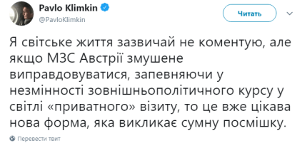 "Частный" визит российского главы Владимира Путина в Австрию, на свадьбу главы МИД Карин Кнайсль вызвал недоумение у официальных лиц и депутатов Украины. В частности, глава украинского МИД Павел Климкин считает, что раз в МИД Австрии оправдываются за приглашение Путина на данное мероприятие, то это уже интересная новая форма внешнеполитического курса страны, которая вызывает грустную улыбку, сообщает ONLINE.UA.