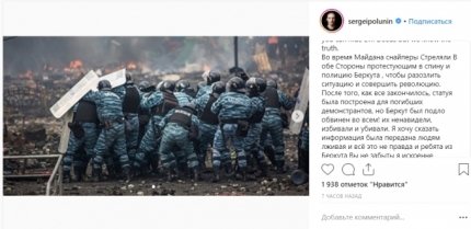 "Во время Майдана снайперы стреляли в обе стороны - протестующим в спину и полицию Беркута, чтобы разозлить ситуацию и совершить революцию. После того, как все закончилось, статуя была построена для погибших демонстрантов, но Беркут был подло обвинен во всем! Их ненавидели, избивали и убивали. Я хочу сказать информация была передана людям лживая и всё это не правда. Ребята из Беркута Вы не забыты, я искренне восхищаюсь тем, что вы стояли против зла и выполняли свою работу, Вы всегда занимаете особое место в моем сердце!" - написал он.