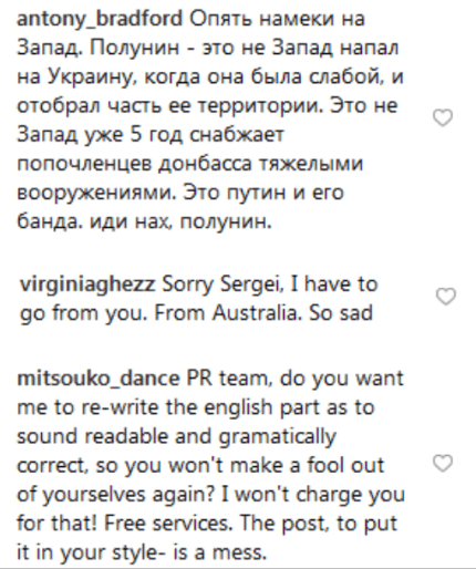 В частности, Полунин написал, что события происходящего во время Евромайдана были поданы недостоверно и отметил, что восхищается действиями бойцов "Беркута", которые позднее получили обвинения за убийства украинцев.