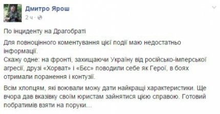 "Для полноценного комментирования этого события имею недостаточно информации. Скажу одно: на фронте, защищая Украину от российско-имперской агрессии, друзья «Хорват» и «Бес» вели себя как Герои, в боях получили ранения и контузии. Всем ребятам, которые воевали, могу дать самые лучшие характеристики. Еще вчера дал указание своим юристам заняться этим делом. Готов побратимов взять на поруки", - написал Ярош.