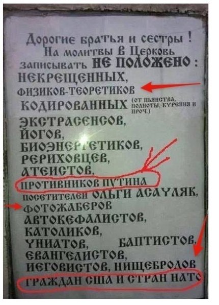 В списке присутствуют некрещенные, физики-теоретики, экстрасенсы, кодированные, атеисты, противники Путина, граждане США и стран НАТО.
