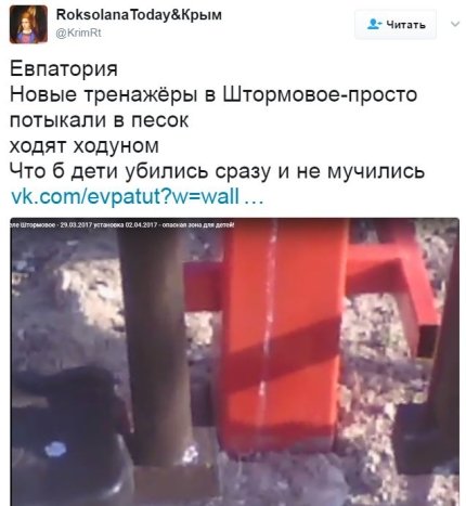 "Евпатория. Новые тренажёры в Штормовое - просто потыкали в песок ходят ходуном. Что б дети убились сразу и не мучились", - написала в Twitter пользователь RoksolanaToday&Крым.
