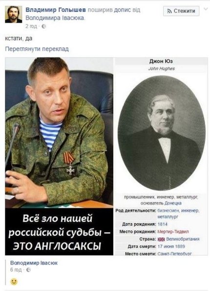 В соцсетях высмеяли слова главаря ДНР Александра Захарченко о том, что англосаксы являются злом "российской судьбы" и вспомнили, что основателем Донецка является британец Джон Юз.
