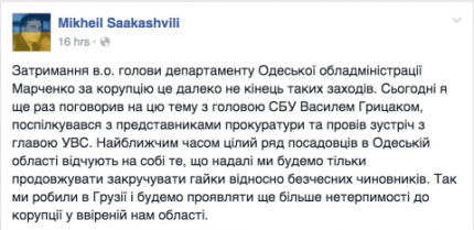 "Задержание и.о. главы департамента Одесской обладминистрации Марченко за коррупцию - это далеко не конец таких мероприятий. Сегодня я еще раз поговорил на эту тему с главой СБУ Василием Грицаком, пообщался с представителями прокуратуры и провел встречу с главой УВД. В ближайшее время целый ряд должностных лиц в Одесской области почувствуют на себе то, что в дальнейшем мы будем только продолжать - закручивать гайки в отношении бесчестных чиновников. Так мы делали в Грузии и будем проявлять еще больше нетерпимости к коррупции во вверенной нам области ", - написал Саакашвили.
