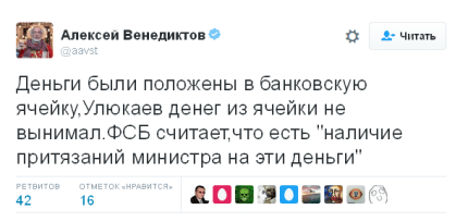 Министр экономического развития России Алексей Улюкаев, которого подозревают в получении взятки в два миллио на долларов, лично не получал этих денег.