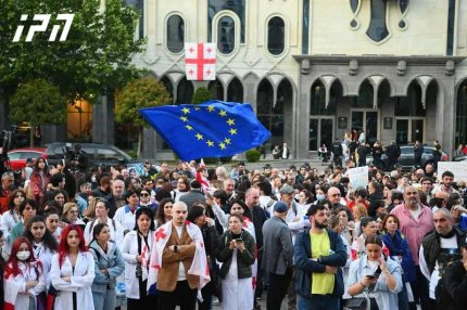 Часть участников акции колоннами пришла в грузинский парламент из разных локаций в Тбилиси, в том числе представители медицинской сферы, которые держат плакаты «Мы — не партия. Наше требование — европейское будущее» и «Будущее страны/наше здоровье в наших руках» и студенты.