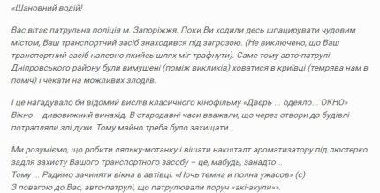 "Пока вы ходили прогуливаться по нашему городу Ваше транспортное средство находилось под угрозой. Мы понимаем, что делать куклу-мотанку и вешать ее как ароматизатор под зеркало заднего вида для защиты Вашего транспортного средства это наверное слишком. Поэтому, советуем Вам закрывать окна в авто", - написали креативные копы.