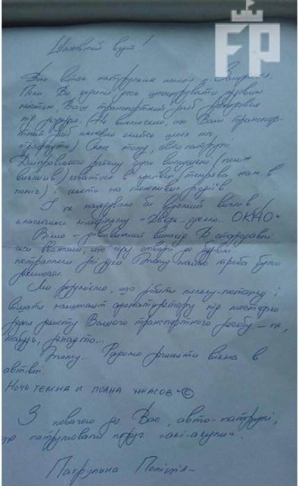 Сообщается, что утром водитель обнаружил на своем авто записку от патрульных полицейских. Примечательно, что записку придала огласке супруга водителя Тамаро Сахно.