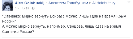 Украинский политтехнолог Алексей Голобуцкий в своем Facebook предложил другое решение — обменять саму Надежду Савченко на украинского режиссера Олега Сенцова.