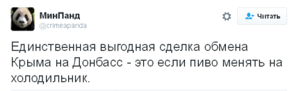 Так, пользователь Twitter-аккаунта МинПанд предположил, что единственной возможностью выгодной сделки будет обмен пива "Крым" на холодильник "Донбасс".