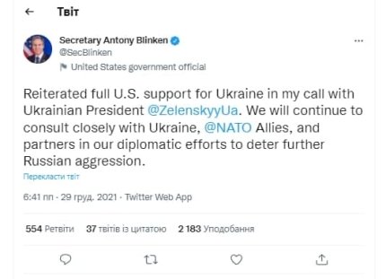 В разговоре с президентом Украины Владимиром Зеленским я подтвердил полную поддержку со стороны США. Мы будем продолжать тесные консультации с Украиной, НАТО, союзниками и партнерами в наших дипломатических усилиях по поводу сдерживания дальнейшей российской агрессии, – написал госсекретарь США.