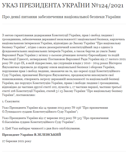 "Отменить: Указ Президента Украины от 14 мая 2013 № 256 "О назначении А.Тупицкого судьей Конституционного Суда Украины"; Указ Президента Украины от 17 сентября 2013 № 513 "О назначении А.Касминина судьей Конституционного Суда Украины". Настоящий Указ вступает в силу со дня его опубликования", - говорится в указе Зеленского.