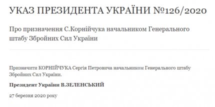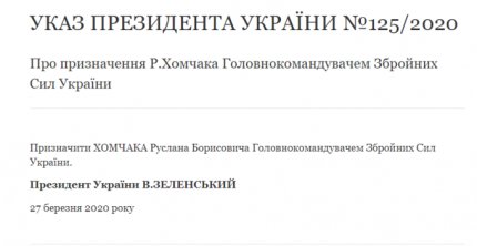 Согласно указам президента, Руслан Хомчак был уволен с должности начальника Генерального штаба – главнокомандующего Вооруженными силами Украины и назначен главнокомандующим ВСУ. Генштабом теперь будет руководить Сергей Корнийчук, который до этого был первым заместителем Хомчака.