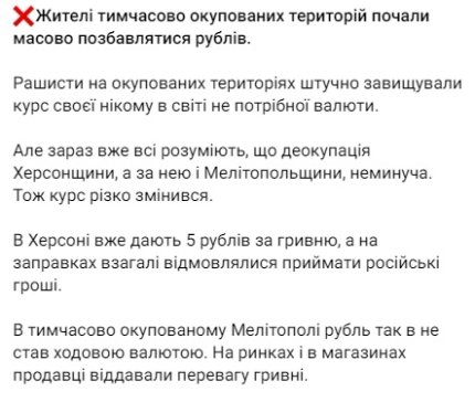 Иван Федоров обращает внимание на то, что украинские граждане на оккупированных территориях спешат избавиться от рублей, а гривны берегут, потому что верят в быстрое освобождение их городов и сел Вооруженными силами Украины.