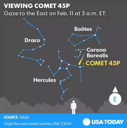 Кроме того, в NASA обещают, что через несколько часов после затмения можно будет увидеть комету 45P, которая в течение последних двух месяцев была видна после захода солнца только в бинокль и телескопы. Комета еще больше приблизится к Земле, и отделять их будет "всего" 11,27 миллиона километров. Видна комета будет на небе в созвездии Геркулеса, следить нужно за яркой сине-зеленой "головой" с хвостом. Более того, в NASA утверждают, что она будет видна до конца февраля.