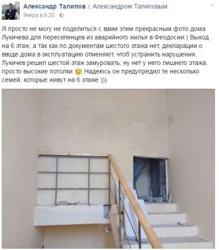 "Я просто не могу не поделиться с вами этим прекрасным фото дома Лукичева (Роман Лукичев, бизнесмен, известный в Феодосии застройщик - ONLINE.UA) для переселенцев из аварийного жилья в Феодосии:) Выход на 6 этаж, а так как по документам шестого этажа нет, декларации о вводе дома в эксплуатацию отменяют, чтоб устранить нарушения, Лукичев решил шестой этаж замуровать, ну нет у него лишнего этажа, просто высокие потолки :Надеюсь он предупредил те несколько семей, которые живут на 6 этаже )))", - написал Талипов и предоставил фото.