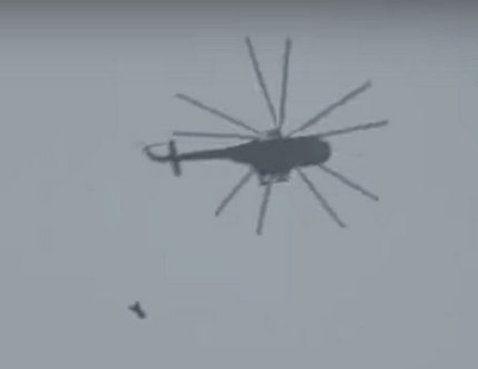 Журналист опубликовал в сети фото, на котором видно, как один из вертолётов правительственных сил Сирии Ми-8 сбрасывает бомбу, а также видео с места событий: