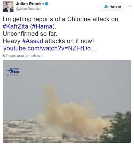По словам Репке, на этот раз целью атаки химическим оружием стал город Карфзита. Он подчеркнул, что, по данным его источников, речь идёт об атаке хлорином.