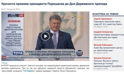Напоследок телеканал «Россия 1» решил вспомнить и о праздновании Дня государственного флага в Украине. Сказав, что «Порошенко снова занимался мифотворчеством», ведущий возмутился заявлением украинского президента о том, что «сочетание синего и желтого цветов, которые символизировали украинский флаг, в Советском Союзе считалось криминалом». В качестве контраргумента почему-то привели гербы футбольных российских клубов, расцветку полицейской машины, а также отыскали желтое и синее в гербе СССР. Хотя Порошенко говорил именно о желтом и голубом как о символе украинского флага, а не просто как о сочетании двух цветов.