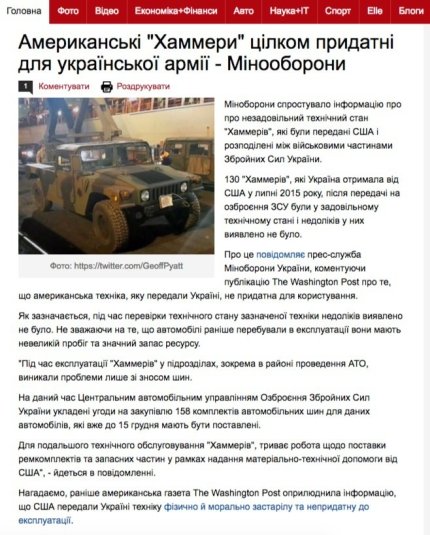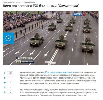Далее ведущий «Вестей», перечисляя использованную технику на параде, заявил, что «130 бэушных хаммеров Киеву сбросил с барского плеча Вашингтон». Российские СМИ уже давно распространяли информацию о том, что предоставленная Соединенными Штатами Украине техника небоеспособна, «второго сорта». Министерство обороны Украины эту информацию опровергло. Тем более, «хаммеры» на параде «были оснащены современными украинскими гранатометами, крупнокалиберными пулеметами и специальными противотанковыми ракетами».