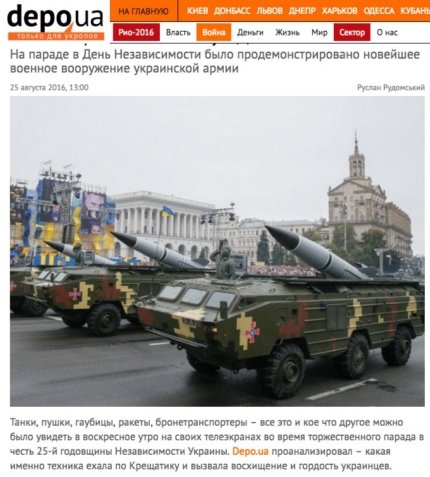 Ведущий программы «Вести» удивился военному параду, который был организован в честь Дня Независимости Украины: «При чем здесь армия? Разве Киев за свою независимость с кем-то воевал?». «И действительно, сложно припомнить, с кем сейчас ведутся военные действия на територии Донецкой и Луганской областей», - отмечает издание.