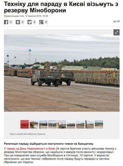 Российского журналиста также не впечатлила боевая техника, представленная на параде: «Практически все боевые машины – модифицированное наследие СССР». Хотя, большинство машин – разработаны в Украине, и только некоторые усовершенствованы. Техника для парада была предоставлена заводами после ремонта и модернизации.