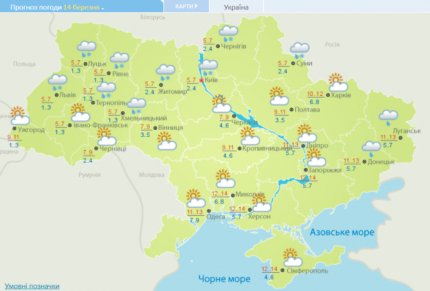 В субботу, 14 марта, циклон доберется до Украины и принесет с собой зиму. В северных и западных областях, а также в Киеве, пройдет снег, а температура воздуха снизится до +5...+7°С в дневное время. Ночью столбики термометров приблизятся к нулю.