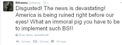Возмущение певицы связано указами Трампа, который выступает за ужесточение иммиграционной политики страны — именно его Рианна и назвала "аморальной свиньей".