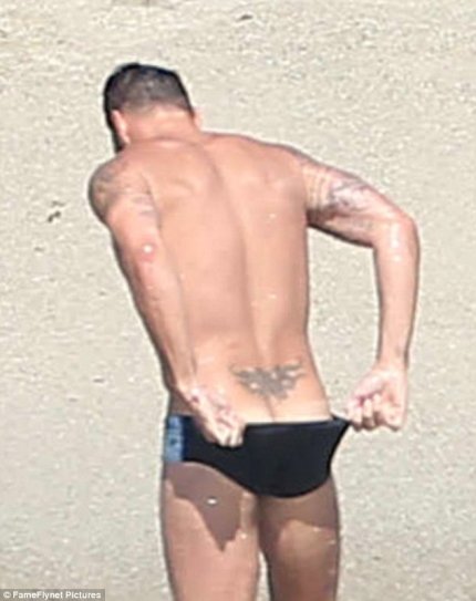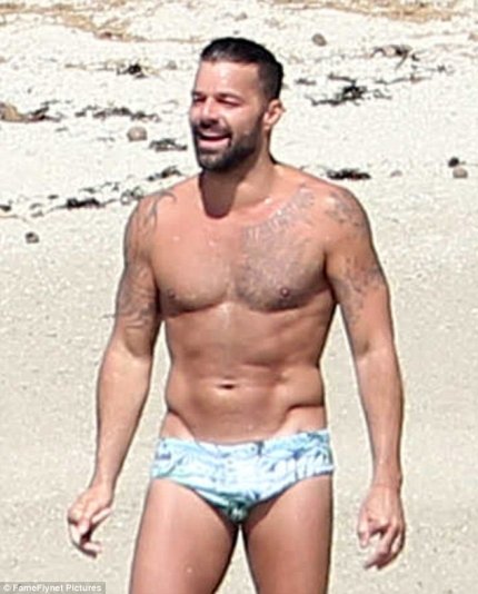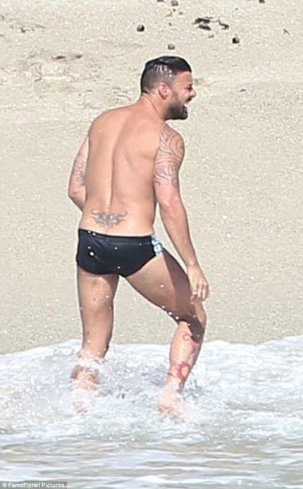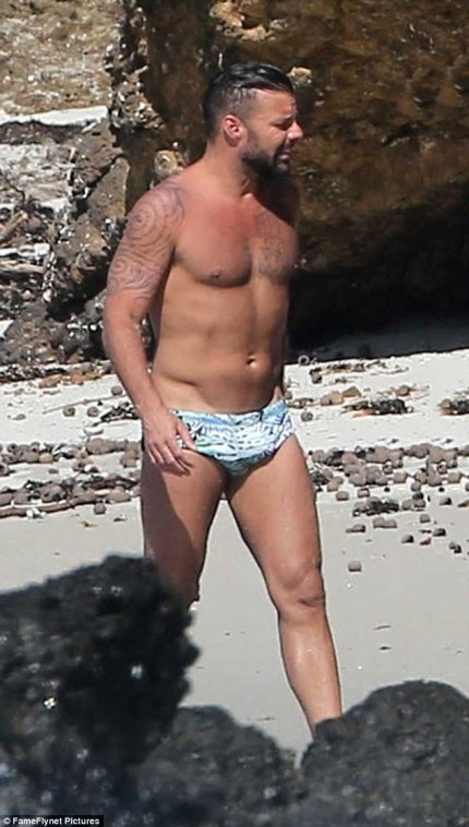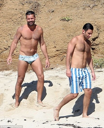 Пара находилась на берегу океана в одних плавках, а Рики Мартина даже удалось подловить в довольно пикантной позе.