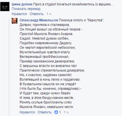 «Прочитал о "сокровищах Азарова" - и вспомнил, как Николай Янович, после отставки 28 января 2014 года, втайне улетел за границу. Многие забыли уже, но не в Россию. В Австрию. К сыну Леше», - написал в своем Facebook журналист Александр Михельсон.