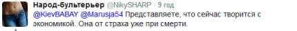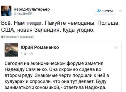"Сьогодні (10 березня - ред.) на економічному форумі помітив Надію Савченко. Вона скромно сиділа в другому ряду. Знайомі чорти підійшли до неї у кулуарах і запитали, що вона тут робить. Буду займатися економікою, - відповіла Надія", - написав він.