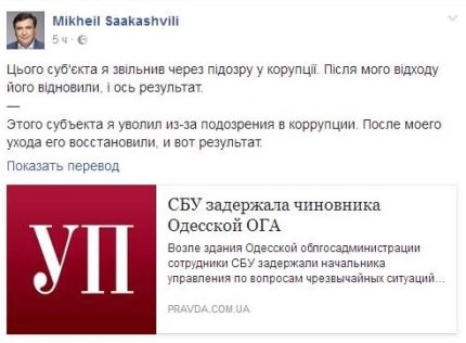 Саакашвілі на своїй сторінці в соцмережі заявив, що звільнив корупціонера, коли був главою області, однак, уже після того, як покинув свій пост, чиновника нібито відновили на роботі.