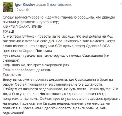 "Поспішаю аргументовано і документовано повідомити, що двічі колишній (президент і губернатор) МІХЕЇЛ СААКАШВІЛІ брехун!" - написав Кисельов.